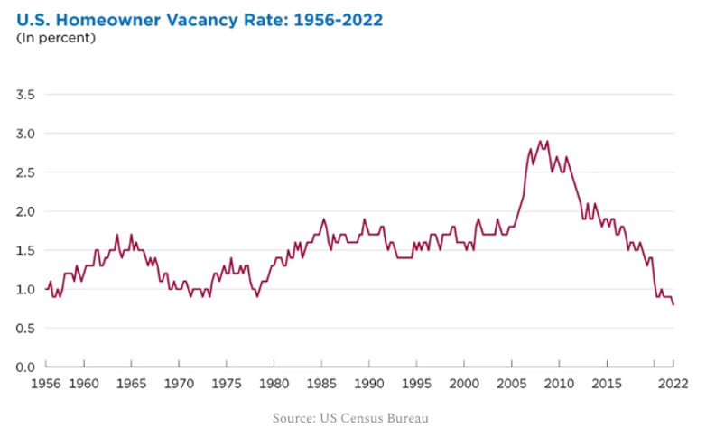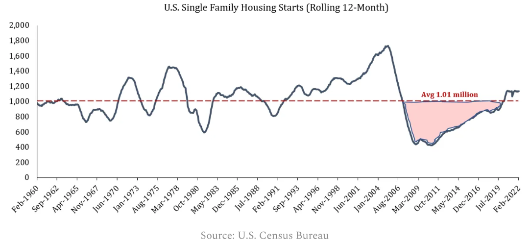 Structurally underbuilt. On average the US built 1 million homes every year since 1960 but post the GFC, between 2006 and 2019 construction was far below this level. Bear in mind, that ~0.25% of housing stock (`350k homes) is demolished every year and needs to be replaced. Couple with this underlying population growth which is 0.60% a year between 2010 and 2022.