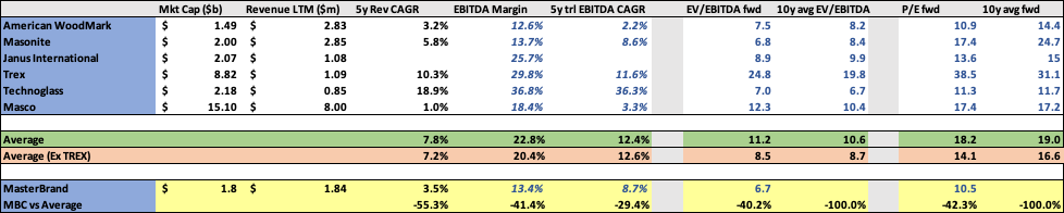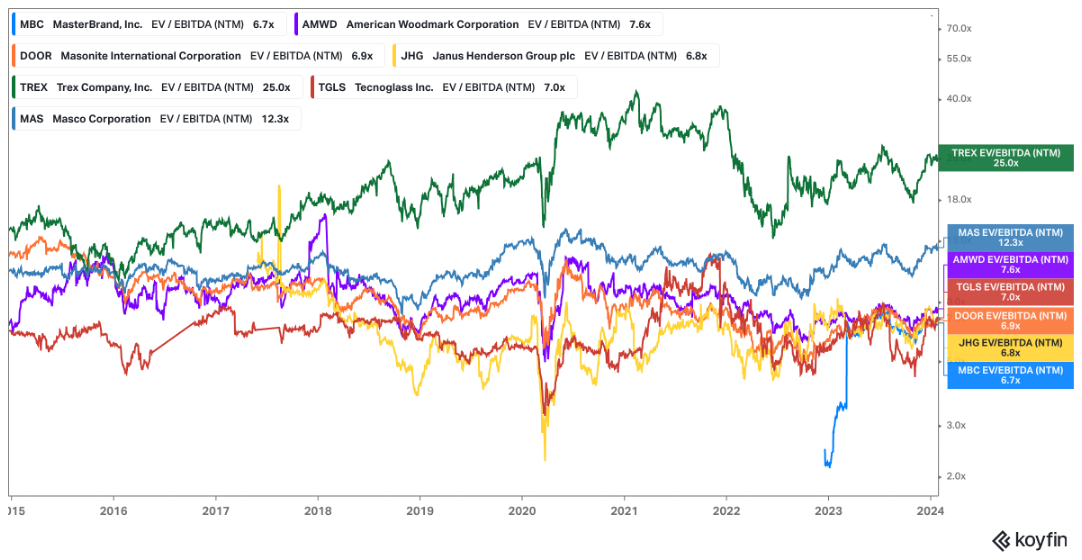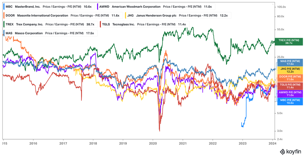 Compared to the rest of the group, cabinets, and doors carry a lower margin and lower growth. Trex is exposed to the same cycle but is a leader in a share-gaining category. They too are an industry leader but a share gainer and category killer, probably not a fair comp.