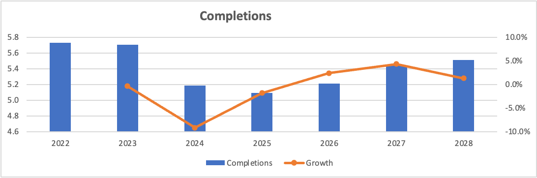 · New Starts –I pulled a forecast from Y-charts for housing starts and run completions at a 2-quarter lag. This forecast has completions down nearly 9% in 2024 digesting the lower starts in 2023 before finally returning to growth in 2026. This matches somewhat with management’s commentary of flat new builds in 2023.