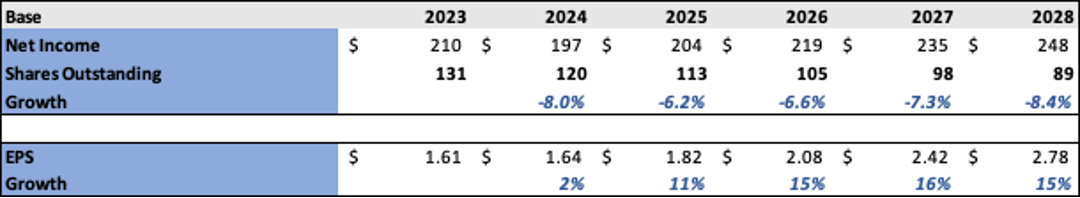 Companies with a low P/E and a HSD FCF margin have a potent ability to juice EPS growth with buybacks. See the model below. This also has the potential to smooth earnings volatility in a downturn.