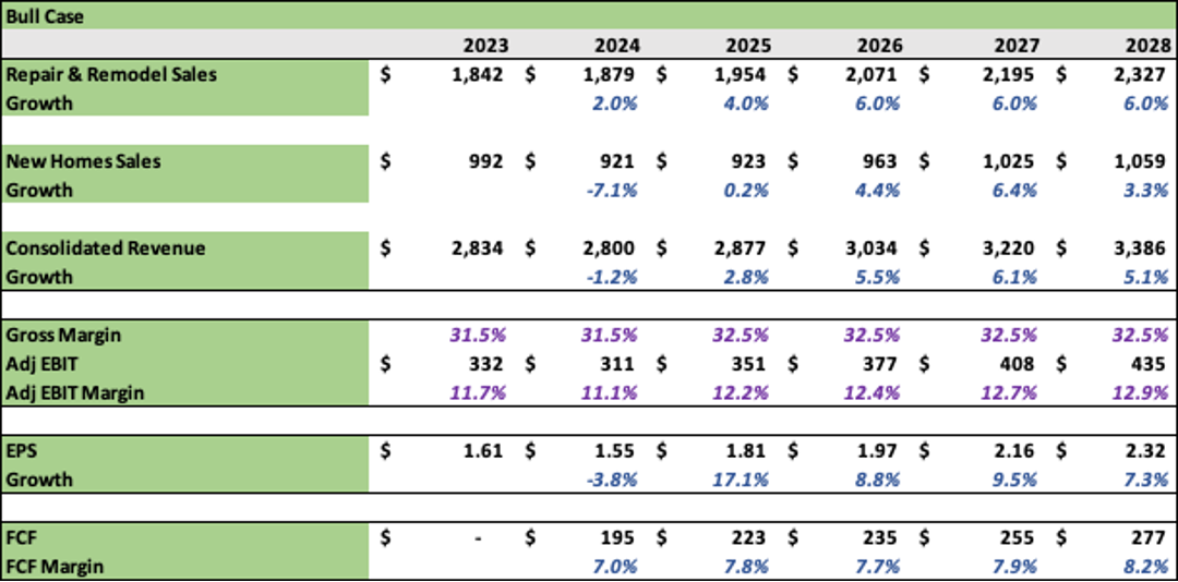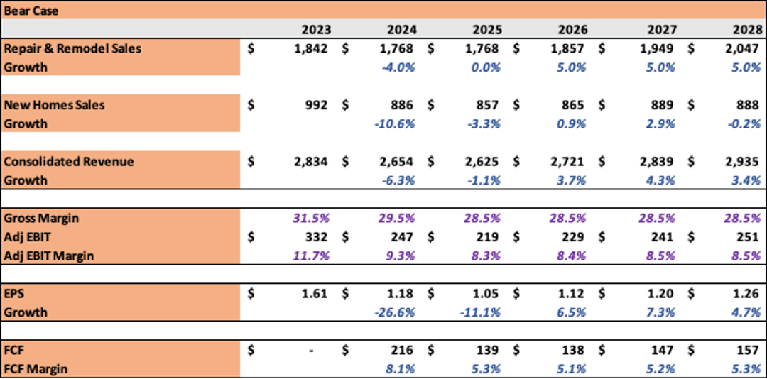 However, in my model, I do not have the company returning to meaningful earnings growth until 2025. I will caution that I may have been over-pessimistic about the pause in the R&R market and the torque remodeling could have to housing starts and lower rates.