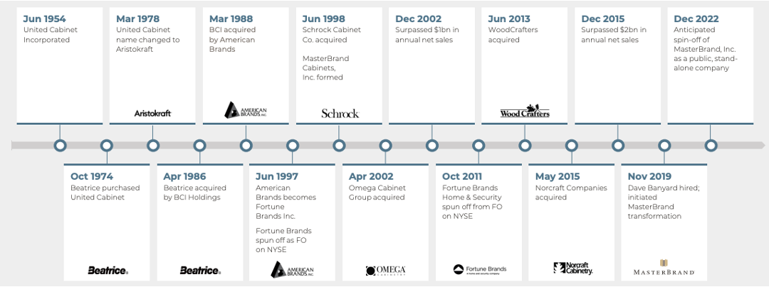 Masterbrand was founded 70 years ago in 1954 under the name United Cabinet. In December 2022 Masterbrand was spun out of Fortune Brands with the issuance of 128m shares where Fortune Brand shareholders receive one share of MBC stock.