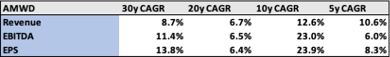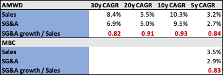 Looking back, these businesses have been able to generate modest operating leverage over the long run. Please note that the 10y CAGR for AMWD is skewed by a large acquisition which generated some operating inefficiency.