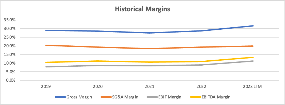Gross margins improved through most of 2023 from ~28.5% to the low 30% range over the coming quarters with management citing operational improvements. It is hard to parse out how much of this is simply moderating raw material costs or tangible operating improvements that we can get excited about.