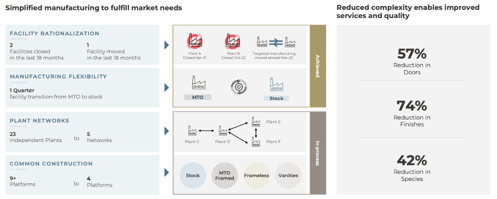 MasterBrand’s history is one of growth by M&A without any real integration. The new CEO is making tangible changes. Dave was a fighter pilot in the US Air Force and then cut his teeth at two of the nation’s greatest operators, Danaher and Roper. He is integrating the disparate collection of brands manufacturing on a single site into a series of multi-brand networks to increase utilization through the cycle. Dave is also converging platforms to generate efficiencies and economies of scale, reducing SKU count by over 70% across the portfolio. I will note, that many of these styles looked very similar to the consumer but may have been manufactured differently.