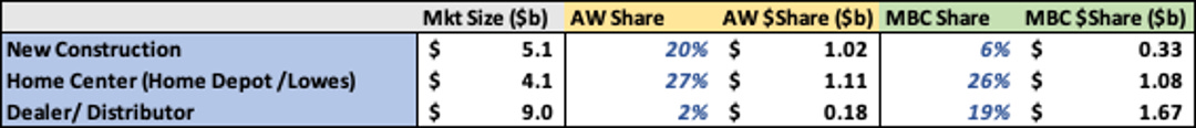 AMWD cites that ~60% of their offering is catered towards value, which would align with their channel mix. All this boils down to lower gross margins but relatively similar EBITDA margins. Servicing one or two large customers (Home Depot/Lowes) will come with some price concessions but likely result in operating efficiencies. The fragmented dealer market will have less influence on pricing but undoubtedly cost more the service. The other point of nuance is that the higher end of the market where MBC plays will require more SKUs to meet diverse tastes adding more complexity.