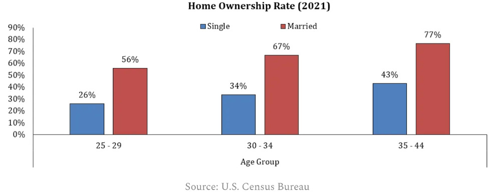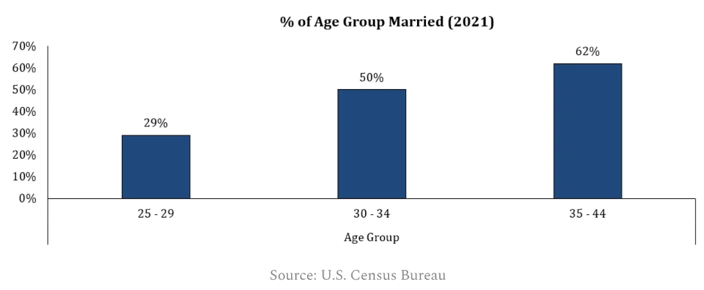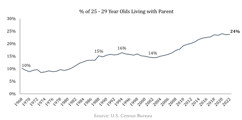 Behavior changes markedly when people turn 30. The percentage living with their parents in the 25-29 cohort drops from 24% to 14% for those between 30-34. Folks also tend to get married in their 30s, this is another key catalyst for household formation.