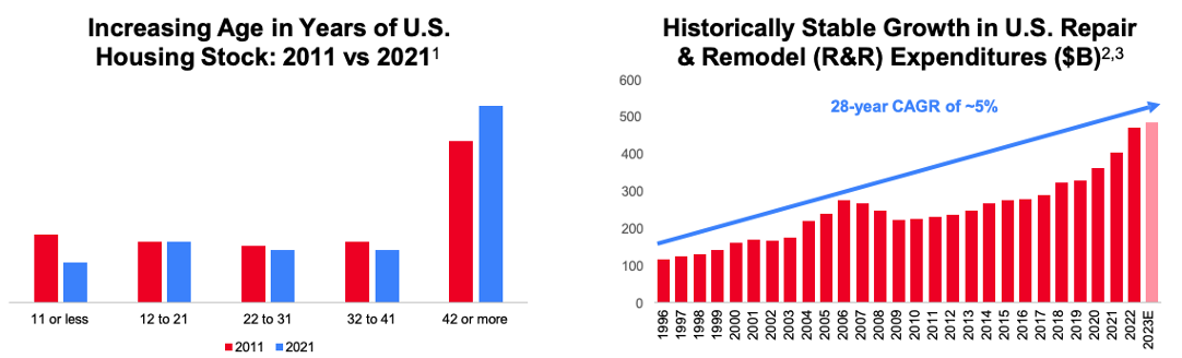 The other key factor is the age of the housing base, with refurbishments providing a solid 5% 28-year CAGR in Repair and Remodel.