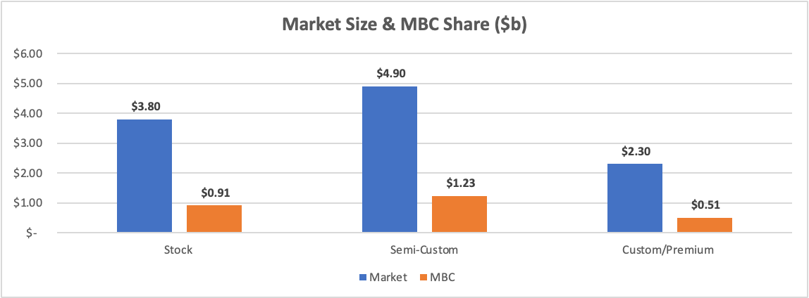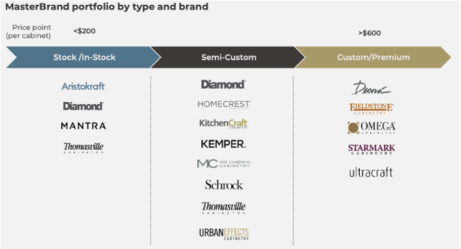 Masterbrand (MBC) is North America’s #1 manufacturer of kitchen cabinets with ~24% market share. The company caters to New Homes (35% Revenue) and Repair & Remodel (65%).