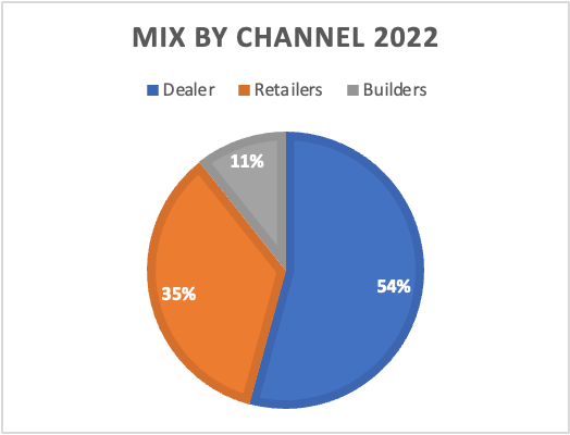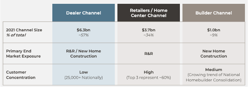 The company has the largest distribution network in North America with 4,500 across three channels: Dealers, Retailers, and Builders. They have a high degree of customer concentration coming from their largest customers with Lowes and Home Depot comprising ~37% of sales in 2022 making up most of the Retailer channel.