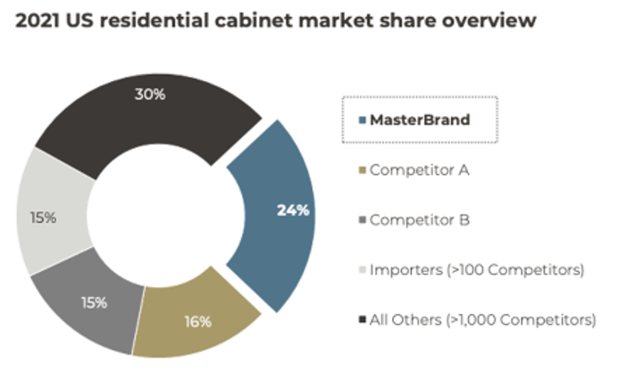 The North American cabinet market was ~$11b in 2021 and Masterbrand has ~24% share spread evenly across the three major price tiers. MasterBrand is ~50% bigger than their next two competitors (individually) who have 16% and 15% share respectively. The remainder of the market remains very fragmented with 100+ importers garnering 15% share and over 1000 independents occupying the remaining 30% of the market.