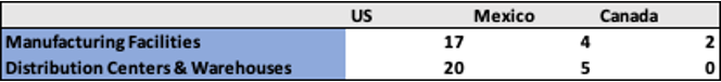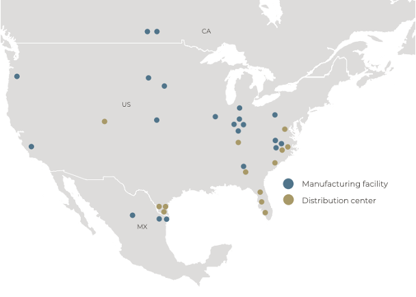 MBC manufactures the majority of its products but utilizes third parties for some items. They have 23 manufacturing facilities and 25 distribution centers across the US, Canada, and Mexico.