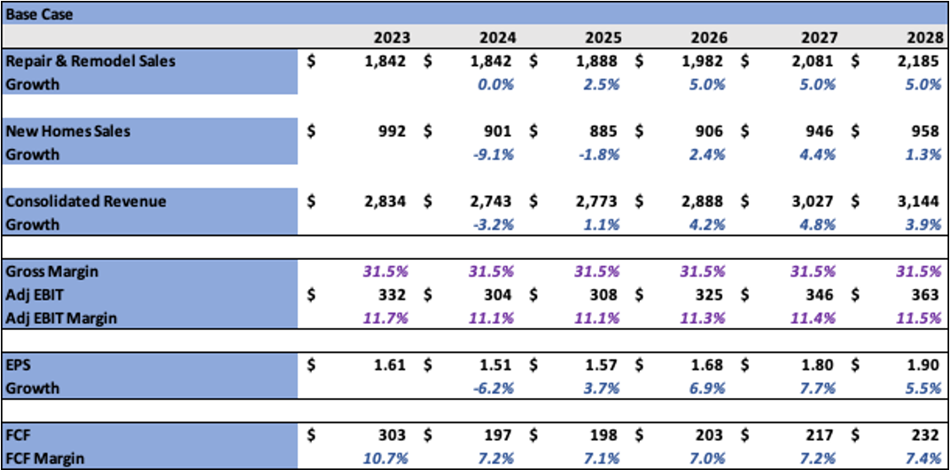 · Repair & Remodel – This has compounded at a 28-year CAGR of 5%, outside of the GFC the largest decline in R&R demand was -2.3% in 2002. Demand in any given year will be dictated by the strength of the economy. I assume 2024 is a transition year for R&R as the economy stabilizes before marching onward in 2025.
