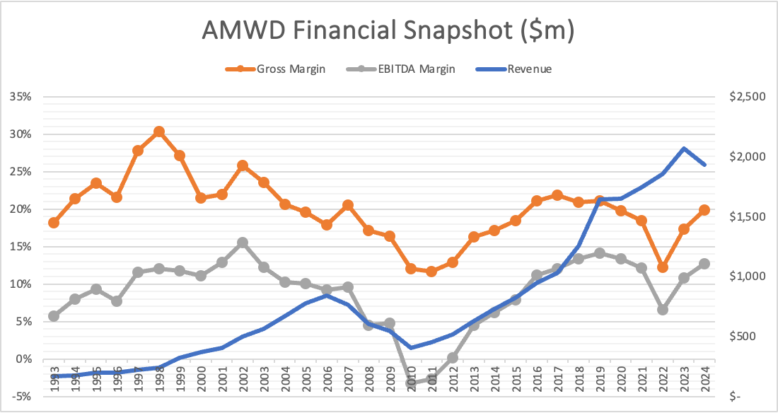 I have looked to their largest competitor, American Woodmark (AMWD), for insight. Their financials are available from 1993 onwards.