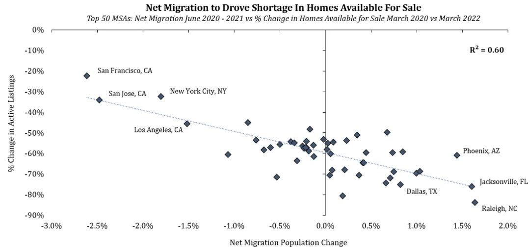 The proportion of the population aged 25-29 living at home with parents went from 14% to 19.7% between the early 2000s and 2022. An incremental 1.34m people who would have otherwise formed a household or occupied an additional unit. Has Gen-Z been saving up money living at home creating pent-up demand for new housing? Some of this pent-up demand was released during COVID and there was not a single MSA in the top 75 that didn’t have a 40% reduction in available inventory compared to the 2016-19 average (As of March 2022).