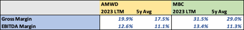 The closest comparison is AMWD. I believe MBC has a higher quality mix of business and should at least trade in line if not slightly above given the superior margin profile and faster growth.
