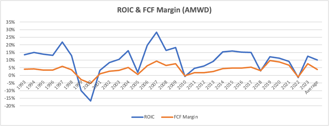 Capital intensity is moderate at 1.5% of sales for MBC since 2019, the long-term run rate may be higher. American Woodmark’s CAPEX has averaged out at 3% of sales over 30 years. This needs to be taken within the context of a MSD FCF margin. If their competitor American WoodMark is anything to go by the long-run FCF margins in the industry are rather low, averaging ~4% over a 30-year history.