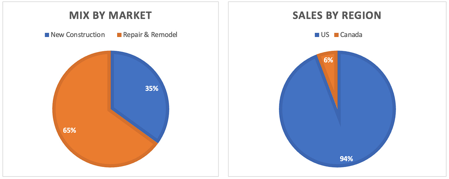 They operate primarily in the US, but Canada makes up ~6% of sales. Repair and Remodel are a larger portion of the mix but there is still a healthy weight to New Construction.